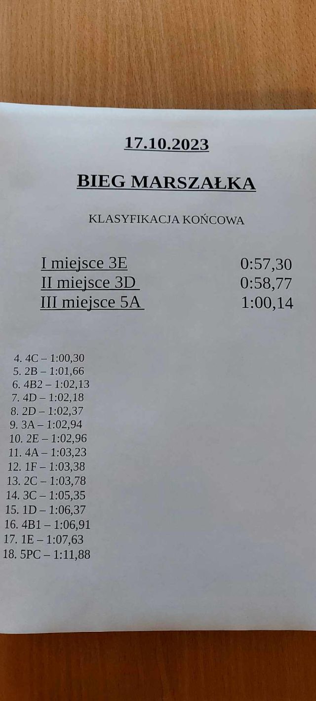 W dnia 17.10.2023 odbył się w naszej szkole cykliczny konkurs sprawnościowy „Bieg Marszałka”. Celem konkursu było uczczenie pamięci Marszałka Józefa Piłsudskiego oraz popularyzacja biegania jako zdrowej i prostej formy sportu. W biegu wzięło udział 18 klas, z każdej klasy wytypowano reprezentację składającą się z 4 osób. Zadaniem uczestników było pokonać trasę i przekazać pałeczkę kolejnej osobie z drużyny.