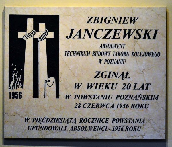 W piątek 23. czerwca w auli szkoły odbyła się uroczystość z okazji zakończenia roku szkolnego 2022/2023.  Zgodnie z wieloletnią już tradycją w jej trakcie oddaliśmy również hołd uczestnikom Poznańskiego Czerwca 56. Pamięć o ofiarach tego robotniczego buntu jest dla społeczności naszej szkoły szczególnie ważna. Wśród nich znalazł się bowiem absolwent Technikum Budowy Taboru Kolejowego (ówczesna nazwa szkoły), dwudziestoletni Zbigniew Janczewski.