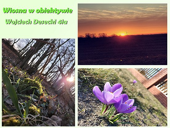 W konkursie fotograficznym zorganizowanym przez Samorząd Uczniowski wzięło udział 9 osób. Wiosna jest czasem budzącej się do życia przyrody. Komisja konkursowa w składzie: Pani Monika Kieblesz, Pani Iwona Kaczmarek i Pan Krzysztof Geddert mieli nie lada wyzwanie, bo wszystkie kolaże są piękne, pomysłowo wykonane, a ukazana na nich wiosna wprawia w zachwyt.